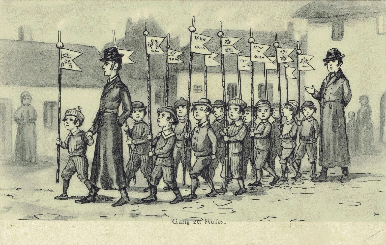 This card shows elementary school teachers guiding their charges on the way to the festive procession with the Torah scrolls that takes place on Simhat Torah, the festival that celebrates God’s giving the Torah to the Jews. Each boy carries a flagpole, decorated with an apple and candle on top. The flags are adorned with lions, crowns and/or the Star of David. According to the National Library of Israel, this illustration was in circulation from 1888.