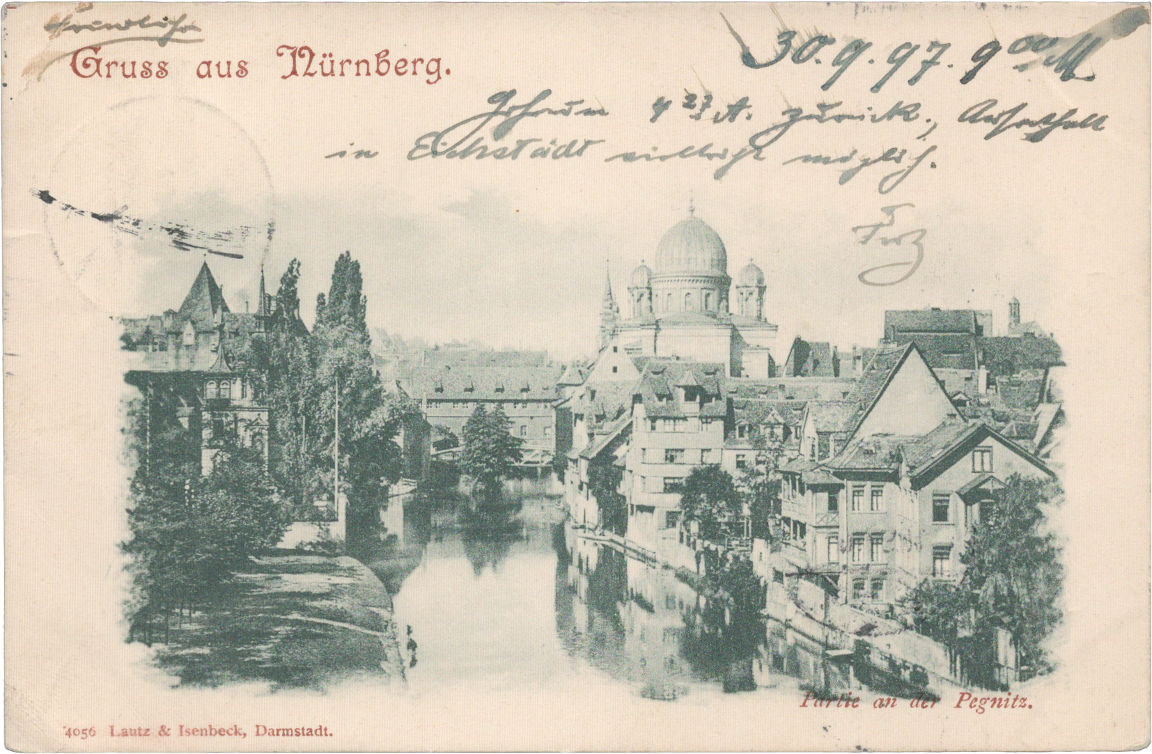 Greetings from Nuremberg. A Stretch of the Pegnitz. Lautz & Isenbeck, Darmstadt. Handwritten date: 30 September 1897.