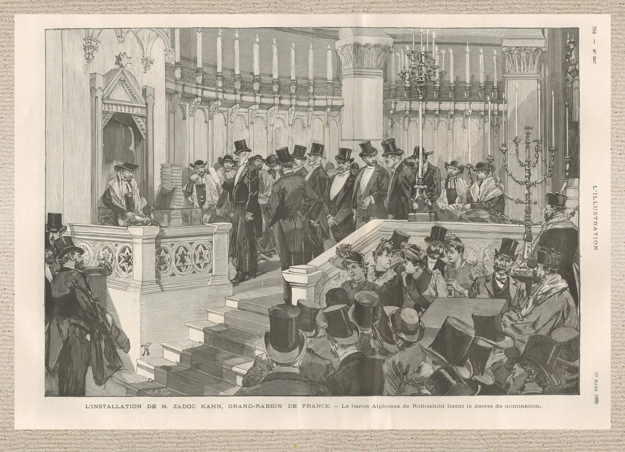 Inauguration of Mr. Zadoc Kahn, Chief Rabbi of France.—Baron Alphonse de Rothschild Reads out the Decree of Appointment. L’Illustration, 29 March 1890. E. A. [Émile] Tilly (drawing), 33.9 x 23.8 cm.